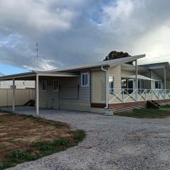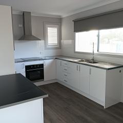 Open plan kitchen with pantry, electric cooking, microwave shelf and island bench that has lockable wheels for moving around