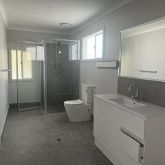 The bathroom is huge and beautifully decked out with tiles and large shower including vanity and toilet